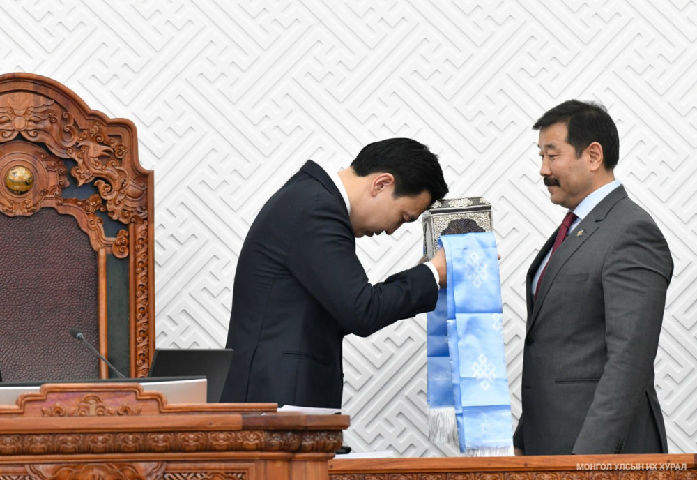 Хуралдаан даргалагч Улсын Их Хурлын дэд дарга Ж.Бат-Эрдэнэ Улсын Их Хурлын даргад гишүүдийн өмнөөс баяр хүргэж, Улсын Их Хурлын тамгыг гардуулав.