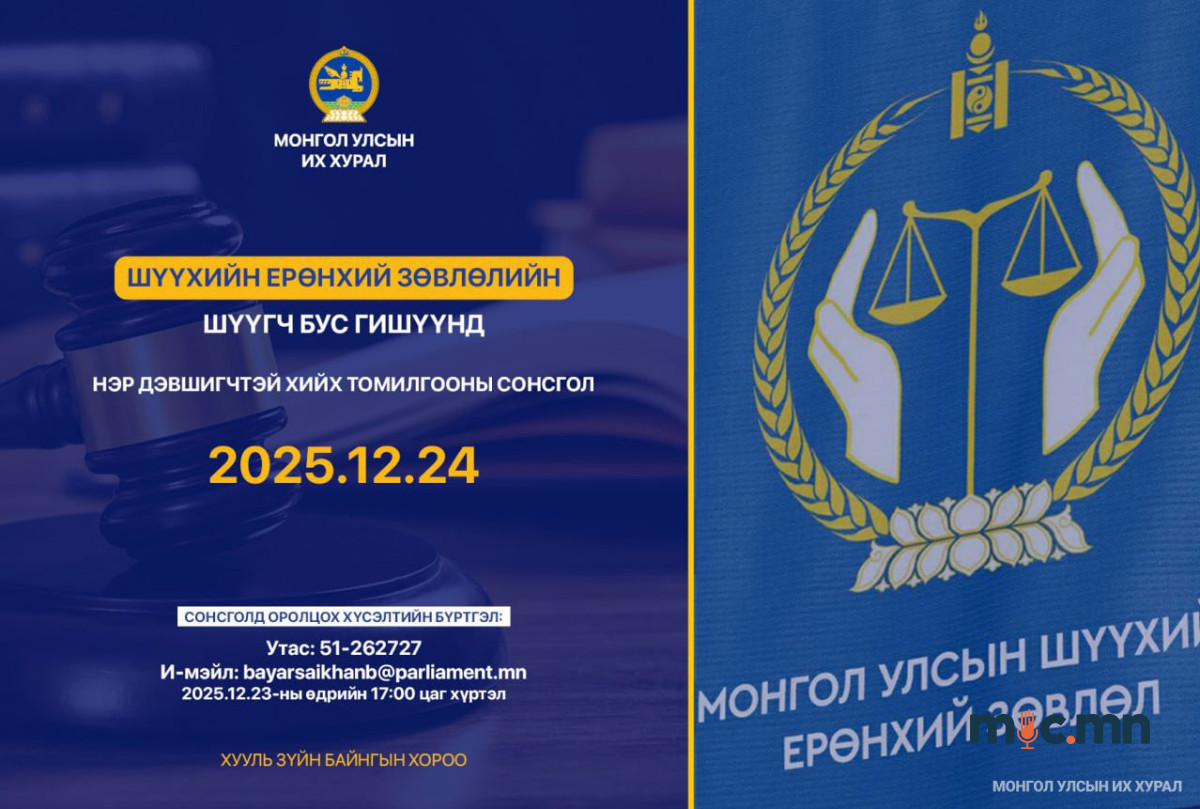 Хууль зүйн байнгын хорооны 2025 оны 12 дугаар сарын 09-ний өдрийн хуралдаанаар Шүүхийн ерөнхий зөвлөлийн шүүгч бус гишүүнд нэр дэвшигч 4 иргэнтэй хийх “ТОМИЛГООНЫ СОНСГОЛ”-ыг 2025 оны 12 дугаар сарын 24-ний өдөр зохион байгуулахаар тогтлоо.
