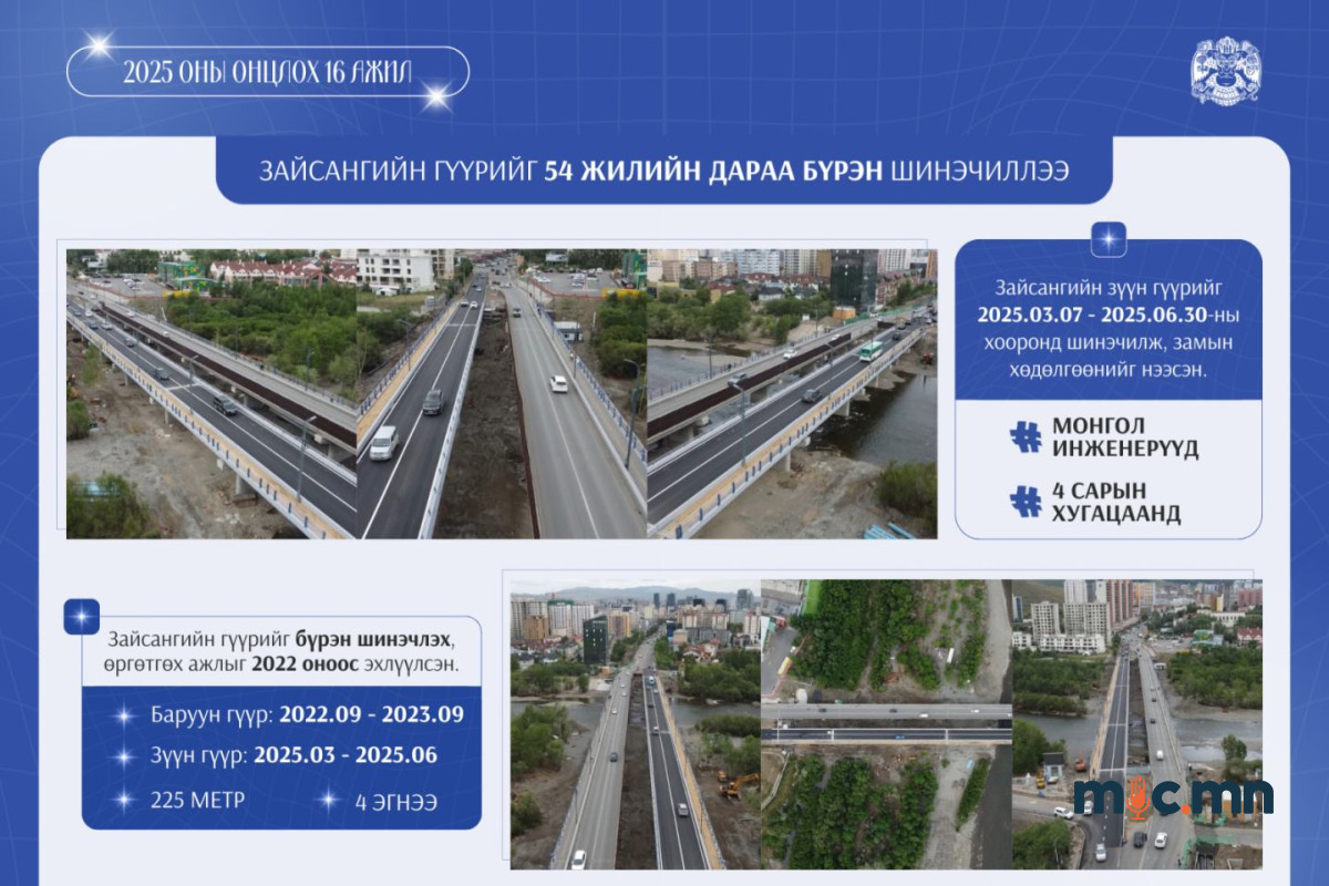 Энэ онд Зайсангийн зүүн гүүрийг өргөтгөж шинэчлэх ажлыг үндэсний бүтээн байгуулагчид, монгол инженерүүд дөрвөн сарын хугацаанд хийж гүйцэтгэлээ. Энэ оны нэгдүгээр сарын 10-наас авто замын хөдөлгөөнийг хааж, хуучин гүүрийг буулгаж, гуравдугаар сараас гүүрийг шинэчлэх ажлыг эхлүүлсэн. Шинэ гүүрийг зургаадугаар сарын 30-нд ашиглалтад оруулсан юм. Гүүрийн бүтээн байгуулалтад “ЗМЗ” ХХК буюу үндэсний бүтээн байгуулагч аж ахуйн нэгж шалгарч, дотоодын чадварлаг инженер, техникийн ажилчид ажилласан. Гүүрийг шинэчилж, 225 метр урт хос гүүр барьснаар дөрвөн эгнээ авто замаас ирэх ачааллыг гүүрээр саадгүй нэвтрүүлэх боломж бүрдсэн юм.