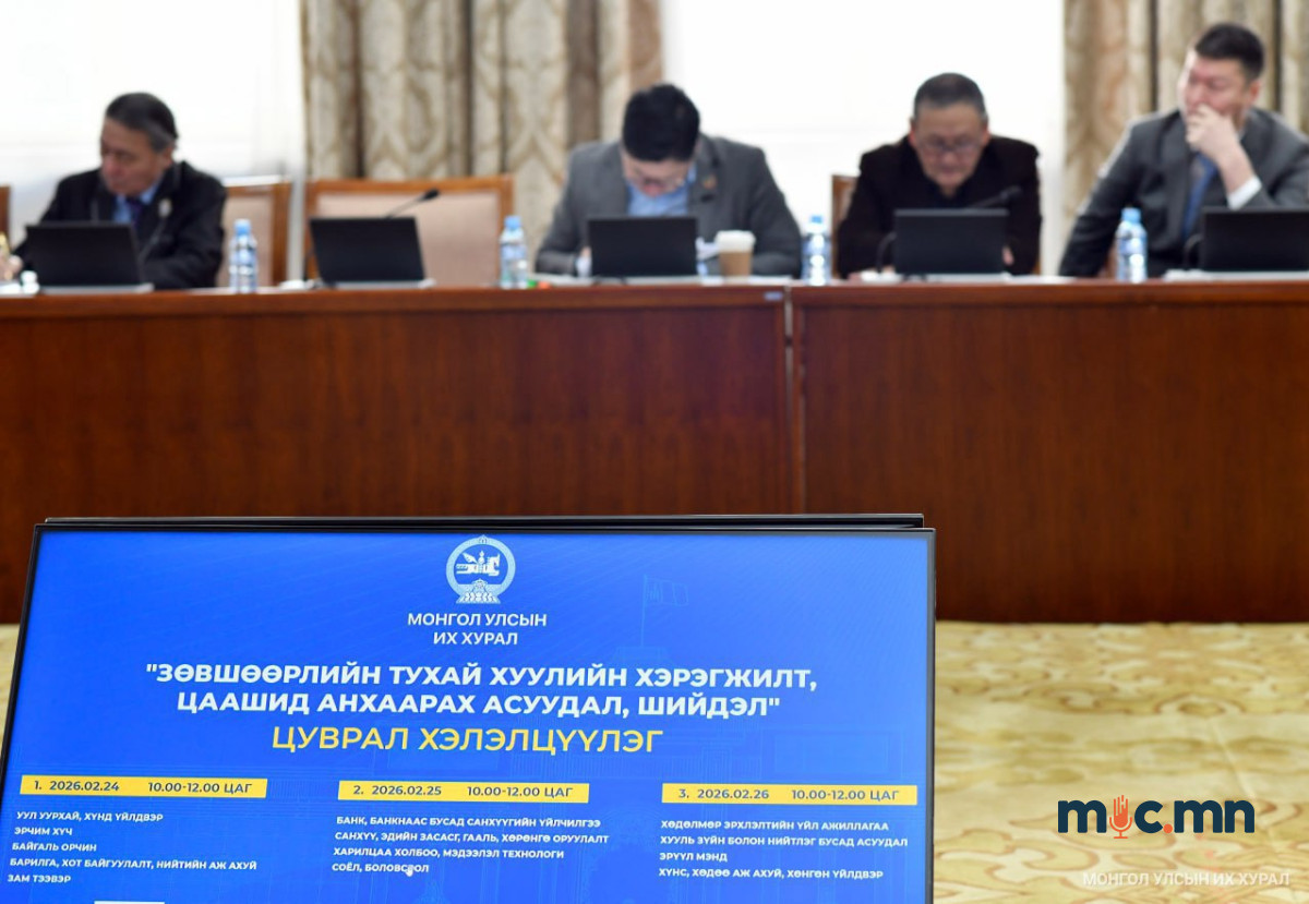Монгол Улсын Их Хурлын даргын 2026 оны 01 дүгээр сарын 14-ний өдрийн 22 тоот захирамжаар Зөвшөөрлийн тухай хуульд нэмэлт, өөрчлөлт оруулах тухай хуулийн төсөл болон хамт өргөн мэдүүлсэн бусад хуулийн төслийг хэлэлцүүлэгт бэлтгэх үүрэг бүхий ажлын хэсгээс зохион байгуулж буй “Зөвшөөрлийн тухай хуулийн хэрэгжилт, цаашид анхаарах асуудал, шийдэл” сэдэвт цуврал хэлэлцүүлэг маргааш (2026.02.25) банк, банкнаас бусад санхүүгийн үйлчилгээ; санхүү эдийн засаг, гааль, хөрөнгө оруулалт; харилцаа холбоо, мэдээллийн технологи; соёл, боловсролын чиглэлээр үргэлжилнэ.
